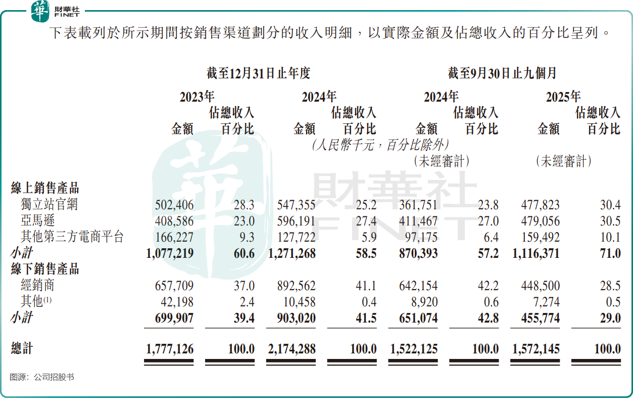 另一方面,C端市场需求相对稳定,使其抗周期性较强,受宏观经济和项目周期波动影响更小。截至最后实际可行日期,公司在14个司法管辖区运营独立站,通过29个主要第三方电商平台的45家线上商店销售产品,2025年前三季度线上渠道收入占比高达71.0%。