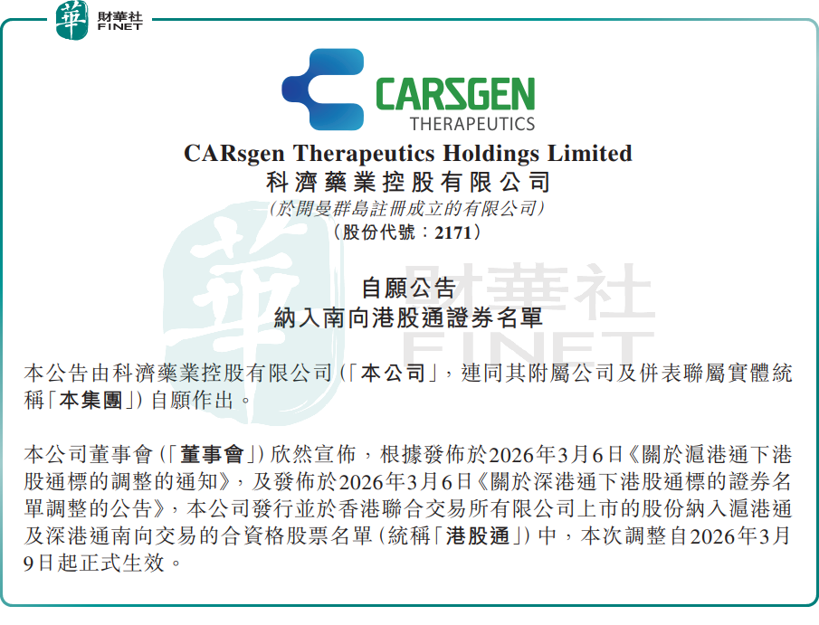 首先,3月9日,科济药业公告称,公司将纳入港股通证券名单中,本次调整自2026年3月9日起正式生效。