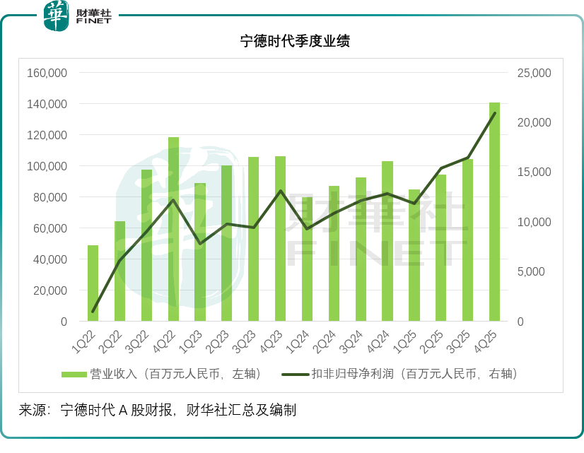 2025年第4季,宁德时代的营业收入同比增长36.58%,至1,406.30亿元;季度毛利率按年提升5.10个百分点,至28.21%;扣非归母净利润按年增长62.98%,至208.89亿元;经营活动净现金流入为525.60亿元,同比增长77.89%,呈现强劲的增长态势。