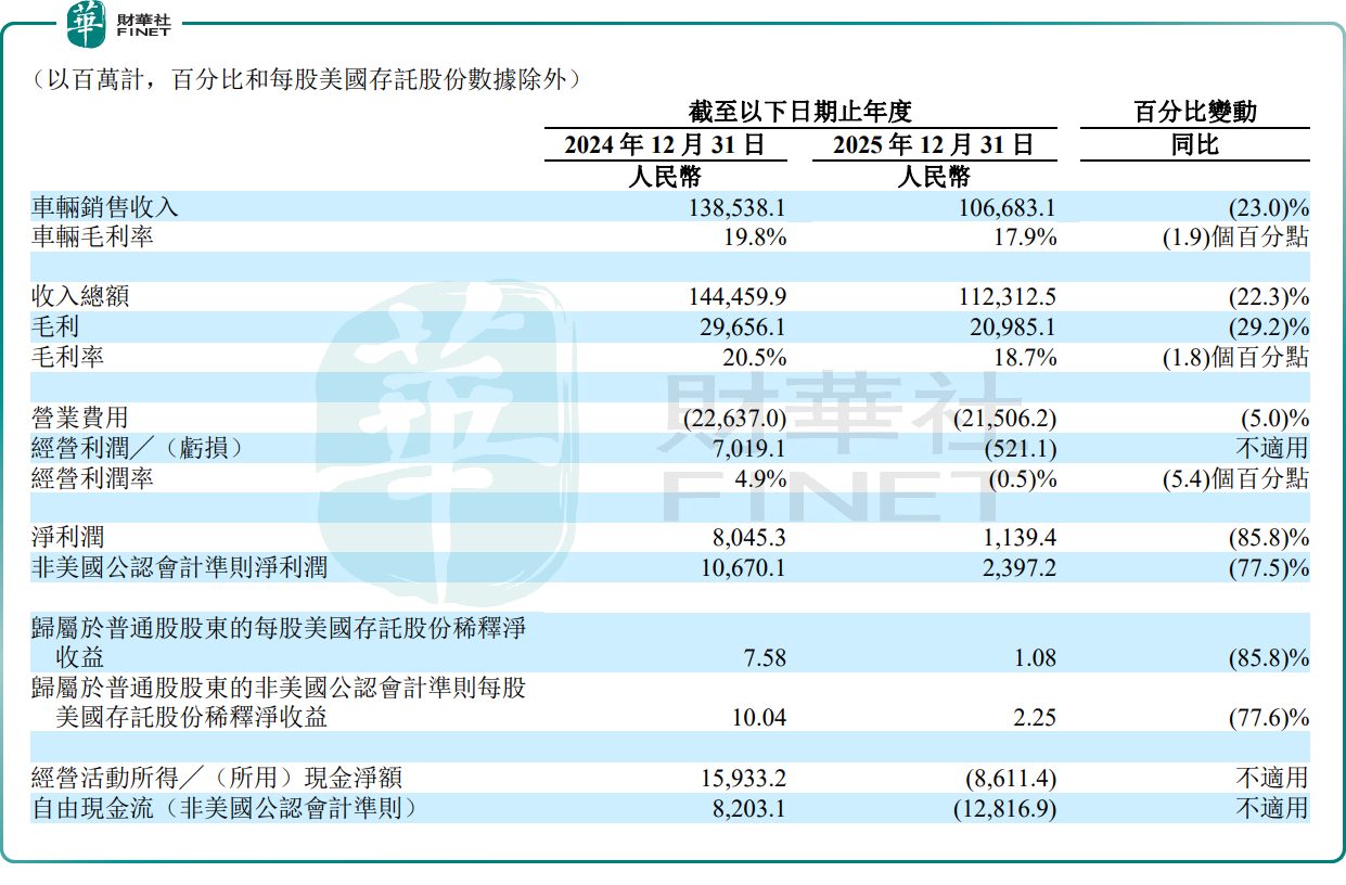 财报显示,2025年,理想汽车实现营收1123.12亿元,同比下降22.3%;净利润为11.39亿元,同比下降85.8%;整体毛利率由2024年的20.5%收窄至18.7%。