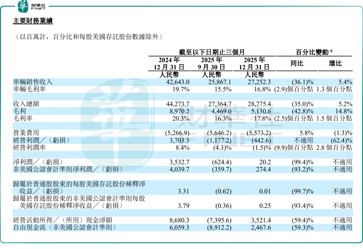 而大和研究的观点较为乐观。该行指出,理想汽车2025年第四季业绩表现疲弱,主要因交付量下跌及研发开支增加。期内收入288亿元人民币(下同),按年下跌35%,按季则上升5%。经调整非公认会计准则净利润2.61亿元,按年大跌94%,按季更下跌172%。全年计,收入按年下跌22%至1,120亿元,经调整非公认会计准则净利润按年下跌78%至24亿元。 管理层预期2026年第一季交付量为8.5万至9万辆,按年下跌3%至8.5%。第一季总收入预计为204亿至216亿元,按年下跌17%至21%;目标2026年销量按年增长逾20%。该行予理想“买入”评级,预期公司去年策略调整后将提升效率。不过,该行相信公司仍需时才能把握具身人工智能的增长机遇。