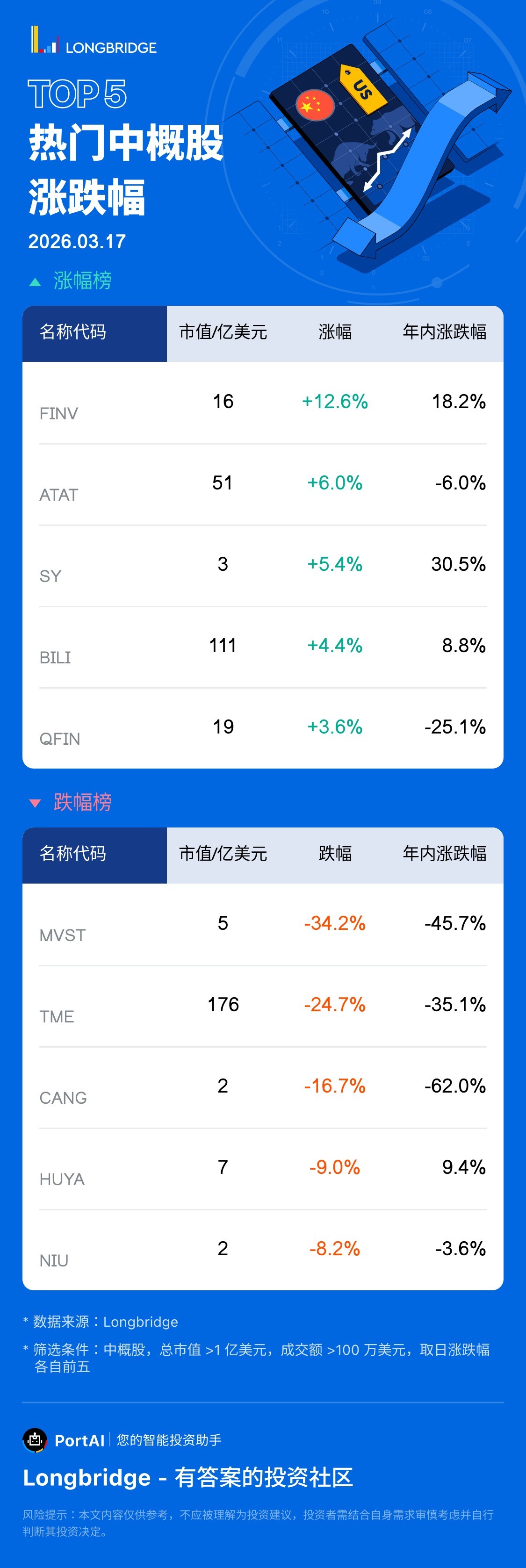 信也科技 (FINV) 涨 12.57%,成交额 1831.5 万美元,年内累计涨 18.2%。