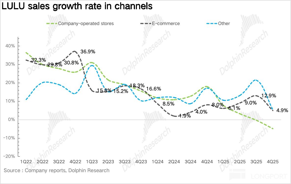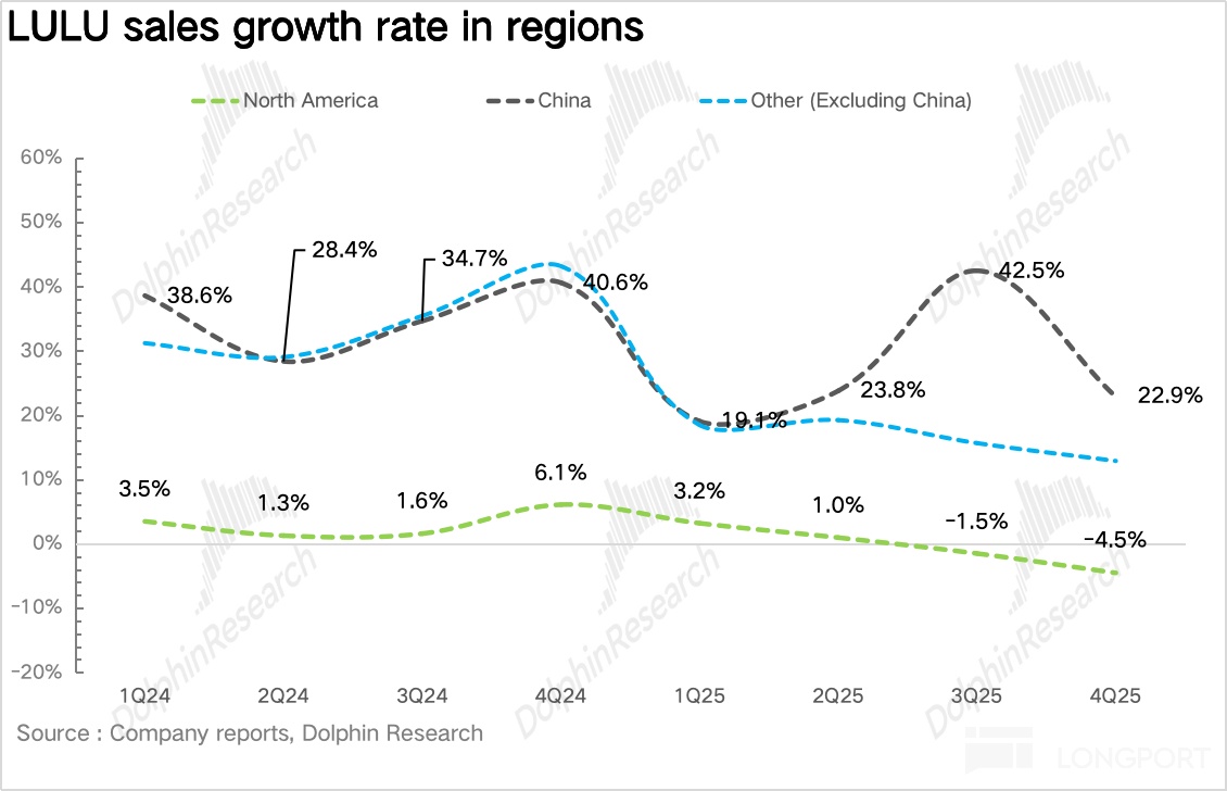 4Q25Lululemon 实现营收 36.4 亿美元,同比增长 0.8%,趋势上增速仍在放缓,增速为近 3 年以来最低水平。如果剔除去年同期多出的额外一周的影响,实际营收同比增长 6%,但也远低于过去几年 15% 以上的高速增长水平,核心还是北美大本营市场陷入了增长停滞。