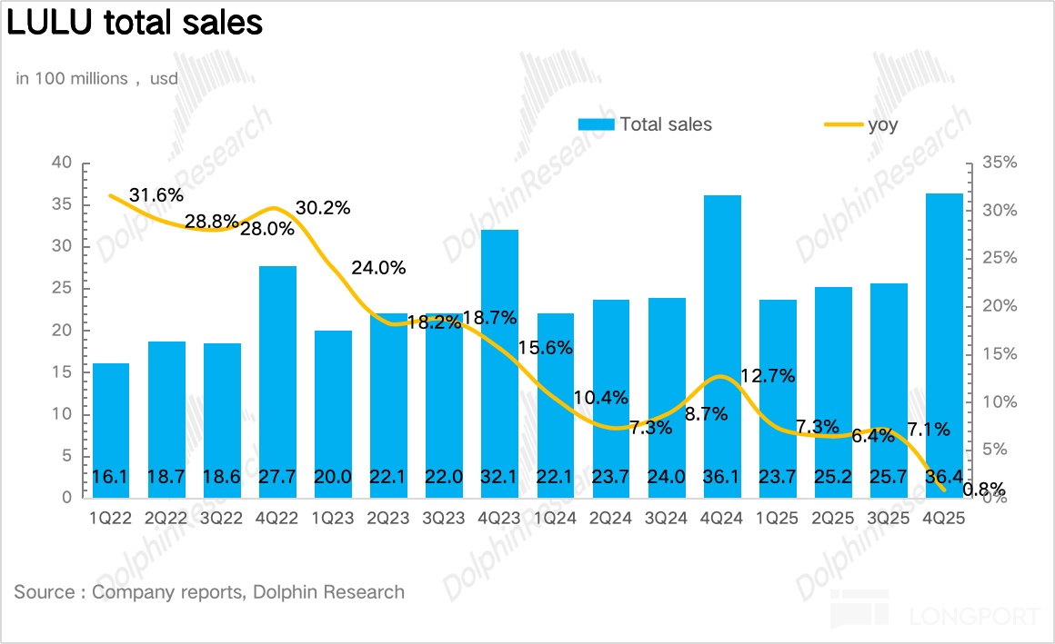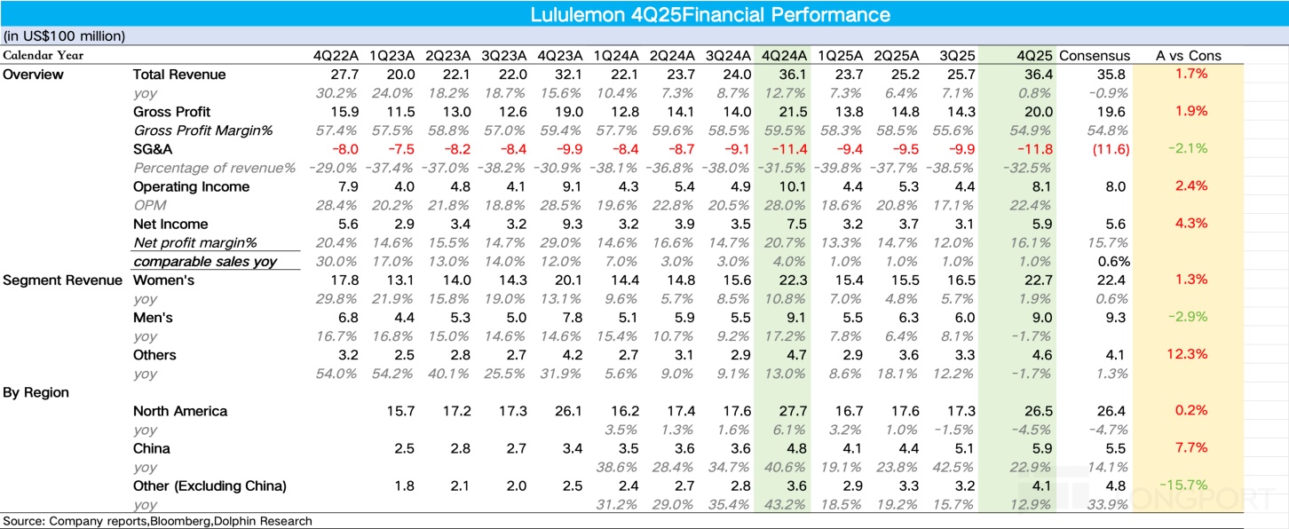 1. 营收小幅超出市场预期。4Q25Lululemon 营收同比增长 0.8%,趋势上增速仍在放缓,增速为近 3 年以来最低水平。如果剔除去年同期多出的额外一周的影响,实际营收同比增长 6%,但也远低于过去几年 15% 以上的高速增长水平,核心还是北美大本营市场陷入了增长停滞。