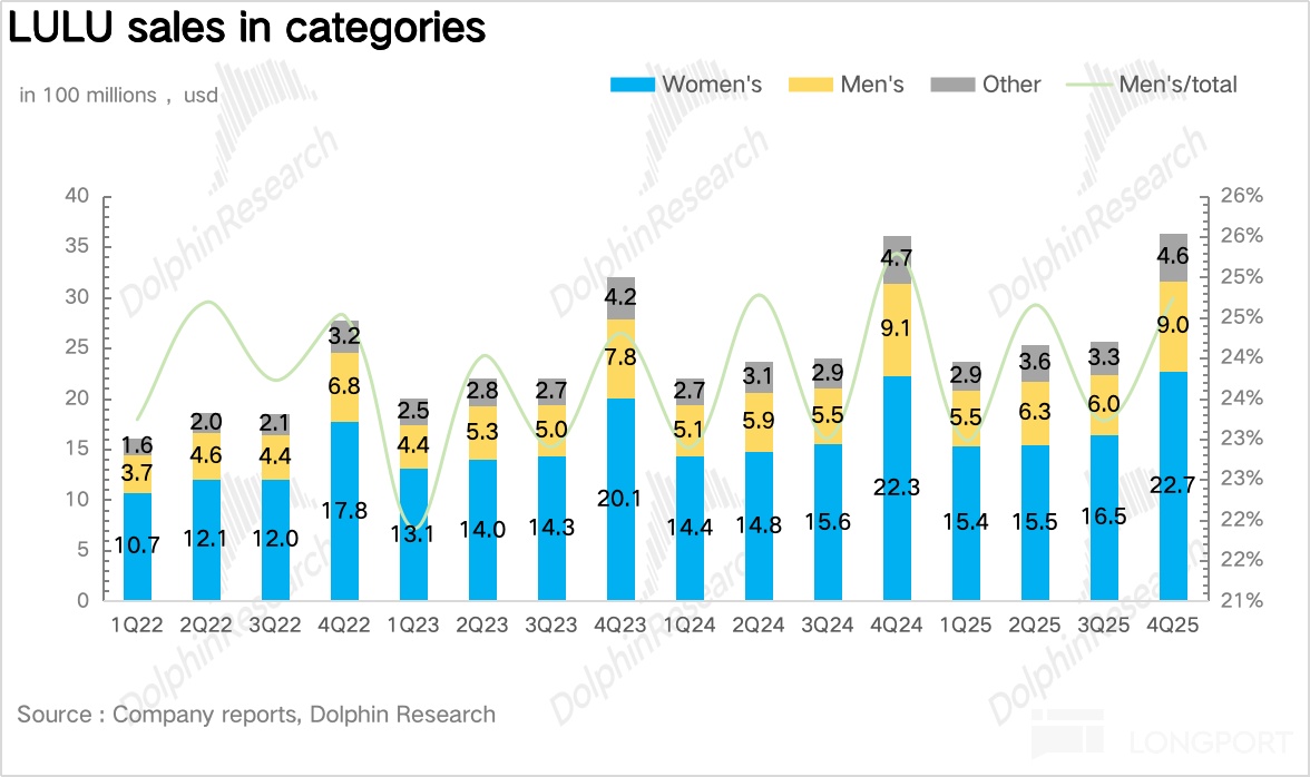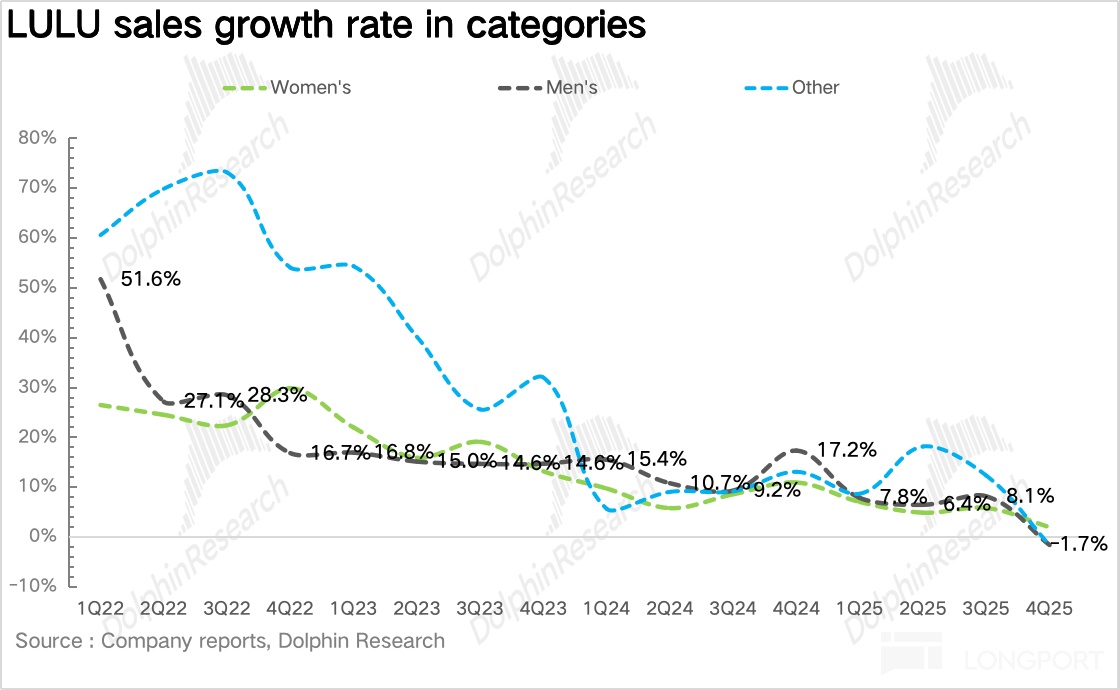 4Q25 男装同比增长 3%,表现一般。具体到品类上来看,在男装上,Lululemon 明显加大了专业场景的拓展,包括高尔夫、专业训练等细分赛道的产品,在海豚君看来,背后明显的意图在于刻意弱化 “瑜伽品牌” 的固有标签,将男装定位成更具体的性能赛道。