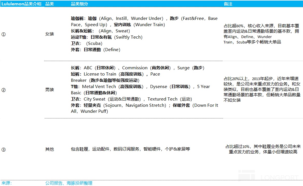根据公司的披露口径,Lululemon 的营收主要来源于女装、男装、其他三个业务,我们先简单介绍一下这三项业务以便后文展开深入分析。