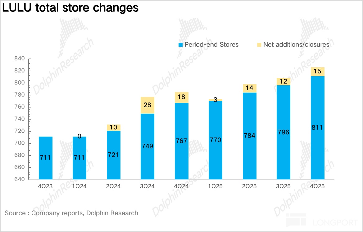4、国际市场加速扩张。截至 4Q25,公司全球门店总数达 811 家,环比净新增 15 家其中中国地区为开店主力策略上以大店为主,此外,公司宣布了史上最大规模的国际扩张计划,2026 年 Lululemon 将进入希腊、奥地利、波兰、匈牙利、罗马尼亚及印度市场,进一步扩大全球版图。
