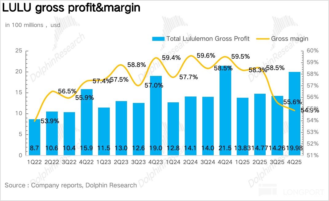 一方面,受到关税的冲击以及最低免税额取消(8 月份生效),公司整体供应链成本显著抬升,另一方面,lululemon 在 Q4 加大了在北美 “We Made Too Much” 渠道的折扣力度,虽然避免了库存积压,但也牺牲了一部分利润,公司毛利率同比大幅下滑 4.6pct。