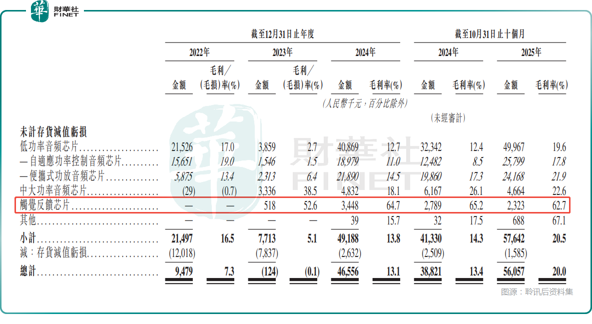 另外,触觉反馈芯片毛利率长期维持在60%以上,是产品中毛利率最高的,这部分产品的收入规模目前很小,但其发展前景有值得期待的地方。