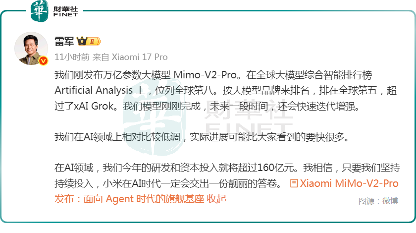 雷军表示,Mimo-V2-Pro的参数规模达万亿级。在全球大模型综合智能排行榜上,位列全球第八。按大模型品牌来排名,排在全球第五,超过了xAI Grok。
