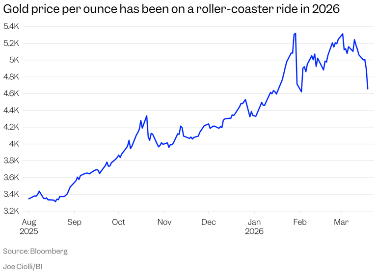 数据显示,黄金已较1月底创下的历史高点下跌约14%。这意味着,在股市承压、债券难以对冲的同时,黄金也未必能够继续稳定承担避险角色。