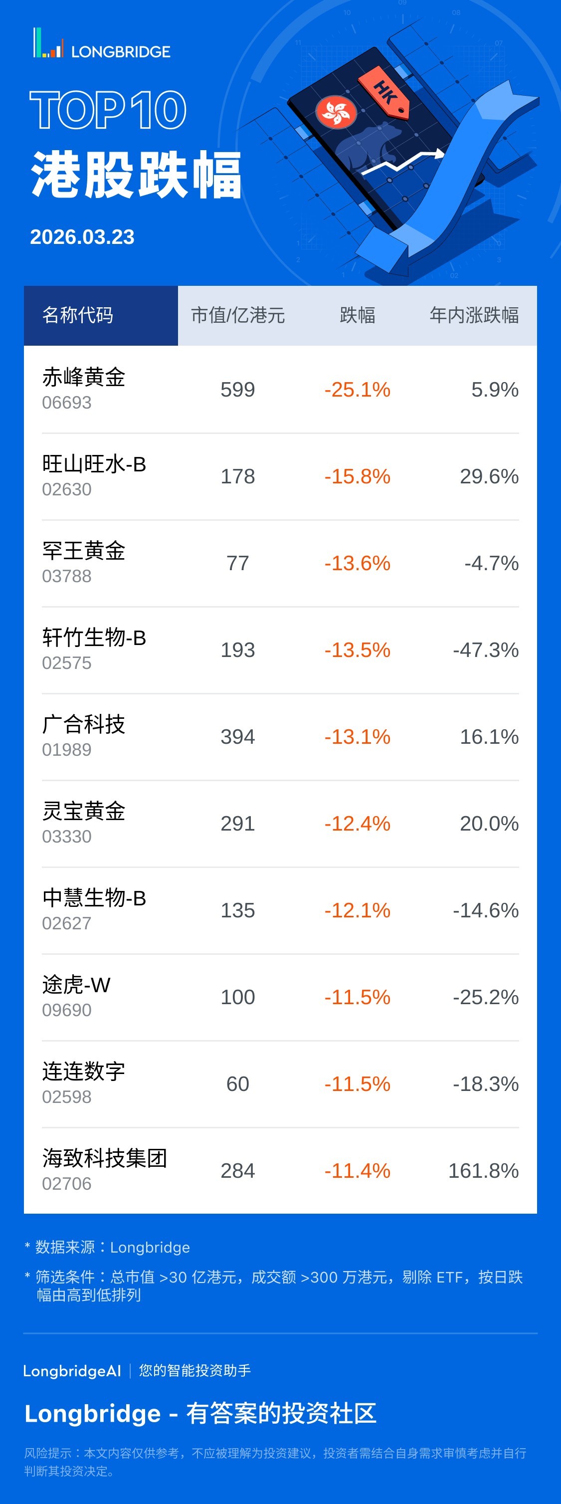 Top 10 港股跌幅(3月23日)
