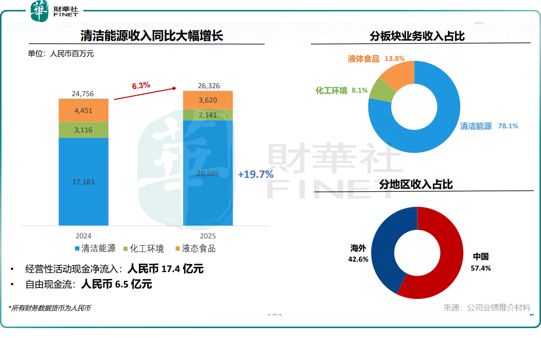 财报数据显示,公司清洁能源分部全年实现收入205.65亿元,同比大幅增长19.7%,占总营收的比重从2024年的69.4%跃升至78.1%,业务集中度与增长贡献度持续提升。与之形成对比的是,受全球化工行业开工率不足、罐箱市场需求放缓影响,化工环境分部全年营收21.41亿元,同比下滑31.3%;液态食品分部则因下游客户资本开支趋于审慎,订单落地进度不及预期,全年营收36.20亿元,同比下降18.7%。