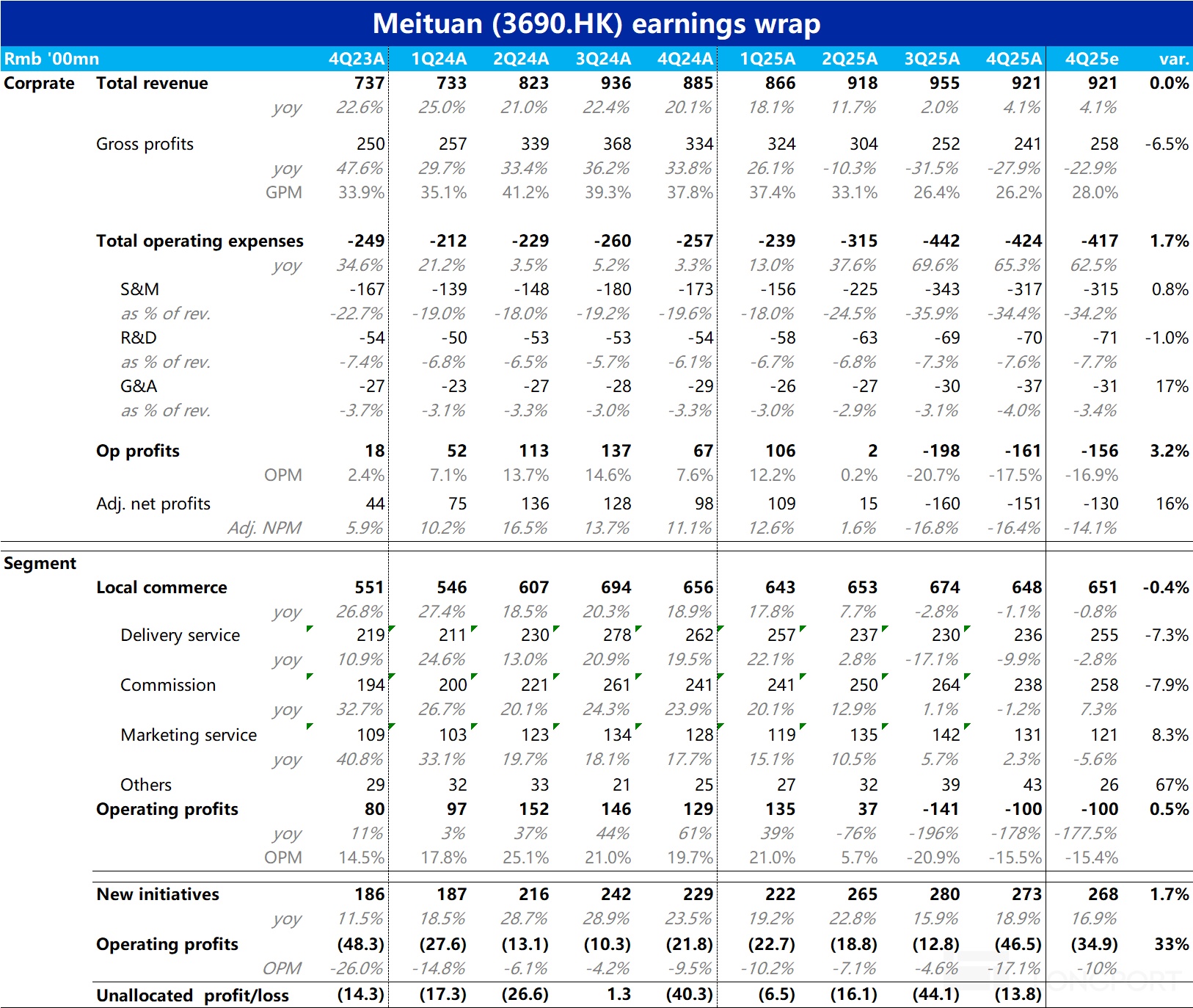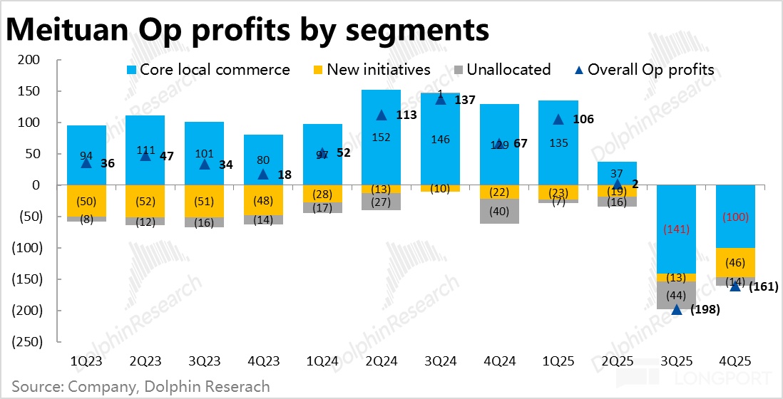 3 月 26 日港股盘后,恒科 “外卖指数” 中最后一个重要玩家—$美团-W(03690.HK) 也发布了 25 年最后一季度财报。由于公司此前已发布盈利预警,核心本地商业板块和集团整体亏损都是明牌,实际表现和预警基本一致。但仔细来看真实利润还是有些不及预期的,因新业务亏损明显扩大,把核心本地商业减亏出的钱又大部分再亏了出去,具体来看: