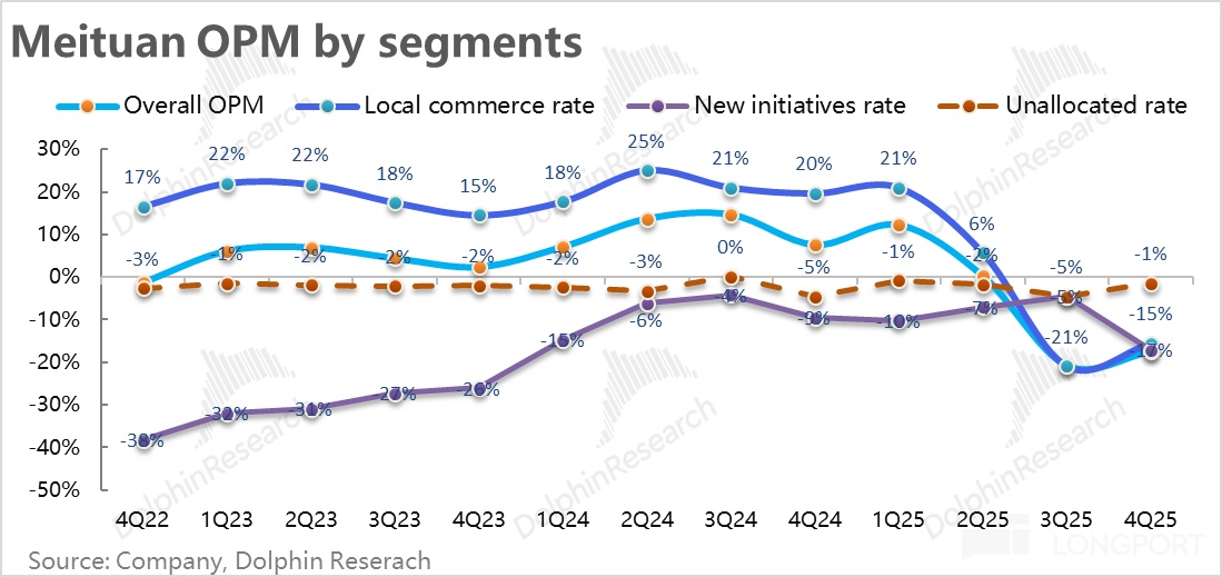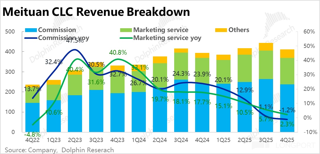 不同于配送收入增长的触底修复,本地商业的佣金和广告本季的收入增速却在继续恶化,佣金收入转为下滑 1.2%,广告收入的增速也从上季的 5.7% 明显下降到 2.3%。考虑到本季到家业务(外卖 + 闪购)对增速的负面拖累应当是有所缓解的,可见是美团到店业务增长进一步放缓的拖累。