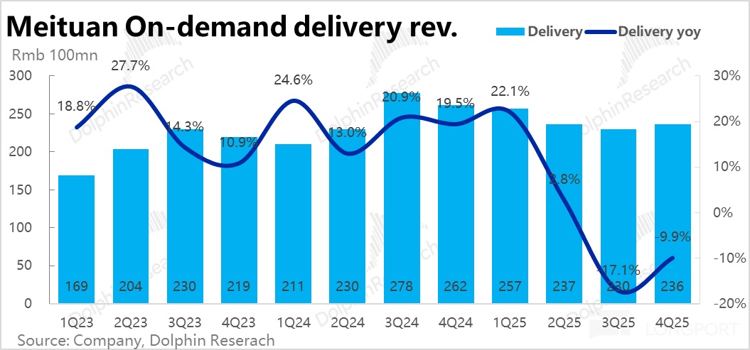 和到家业务(即外卖 + 闪购)强绑定的配送性收入本季同比下滑幅度从上季的 17% 收窄到约 10%,如上季提过的,这主要是美团给骑手的补贴会记为收入减项的原因结合市场预期的即配单量增速,隐含单笔配送收入同比减少幅度从上季的约 40% 收窄到了约 30%(仅供参考)。
