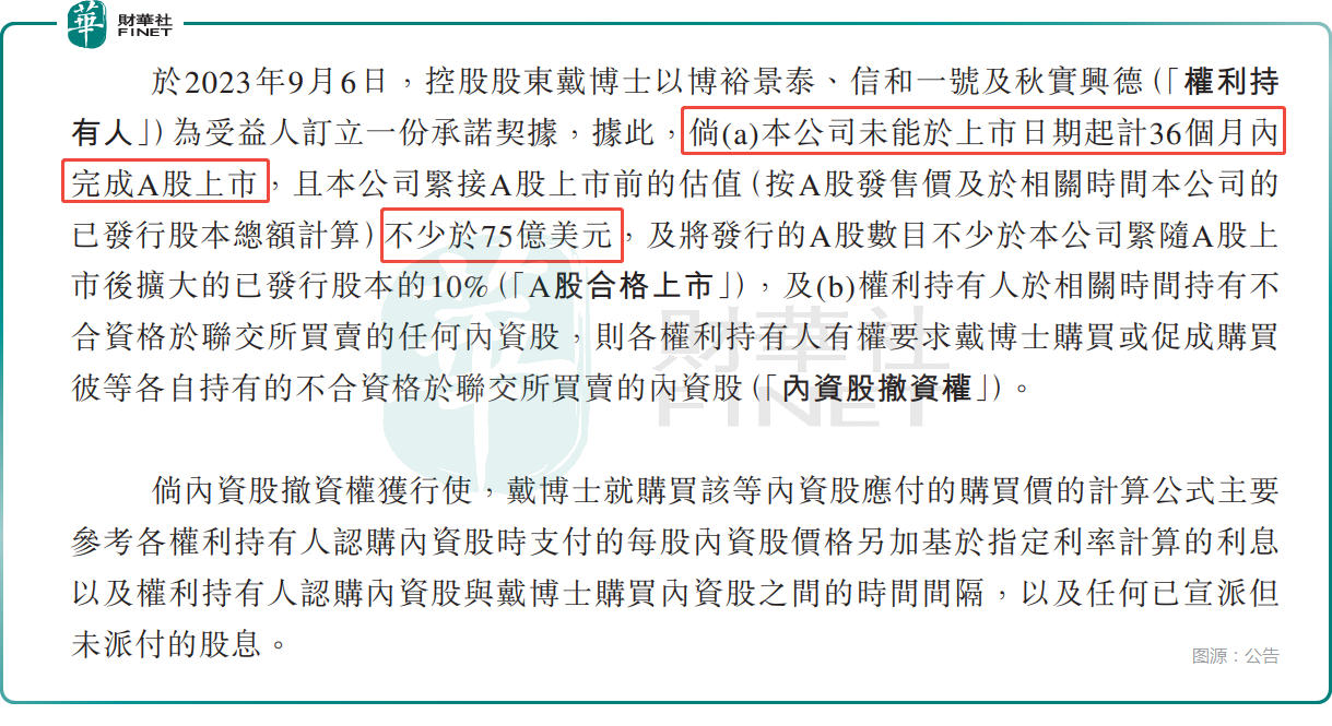 根据资料,于2023年9月28日港股上市前夕,范式智能实控人戴文渊与博裕资本等投资方达成明确条款:需于2026年9月27日前实现A股上市,且公司紧接上市前的估值不低于75亿美元,且A股发行规模不低于发行后总股本的10%。若未能达成上述条件,投资方有权要求戴文渊以个人身份回购内资股,且回购资金不得来源于公司。
