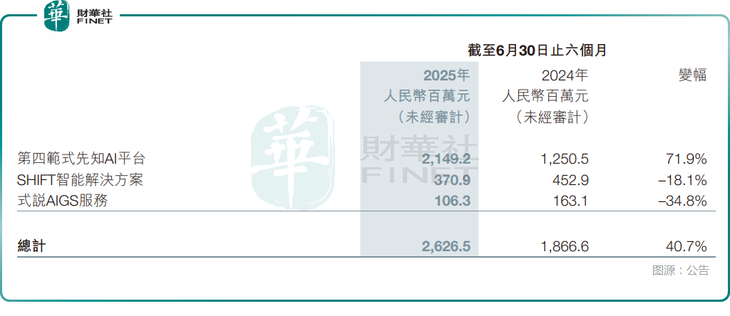 分业务来看,2025年上半年,核心业务先知AI平台收入达21.49亿元,同比大增71.9%,还要高于整体收入的增速,占总收入的比重大幅提升至81.8%,主要系集团深入推进“AI Agent+世界模型”的落地及应用,充分捕捉企业客户高价值场景下的AI转型需求。