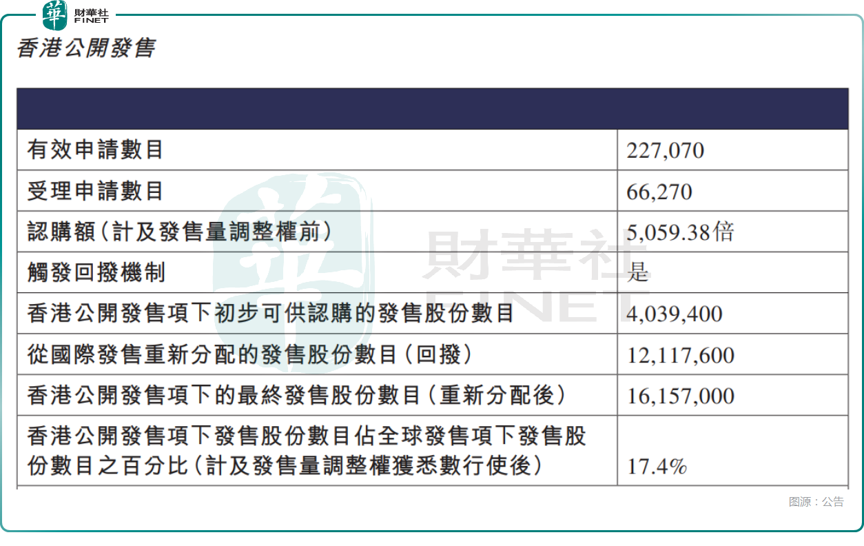 从日前招股阶段的表现来看,香港公开发售方面,获5059.38倍认购,公开发售的发售股份最终数量为1615.70万股,占发售股份总数的约17.4%;合计获得约22.71万份有效申请,受理申请数目约6.63万份,申购一手获配发股份占所申请股份总数的概约百分比为5.0%。