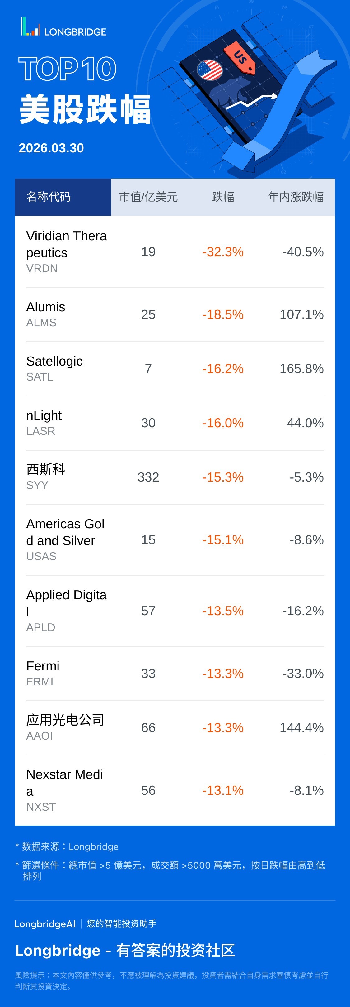 Viridian Therapeutics(VRDN) 跌 32.35%,成交额 2.5 亿美元,年内累计跌 40.5%。