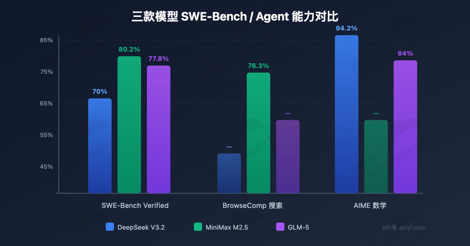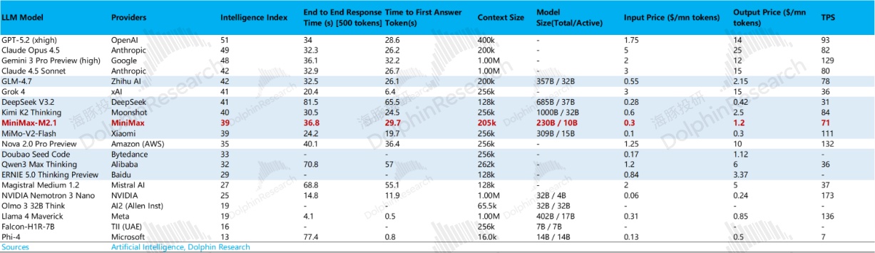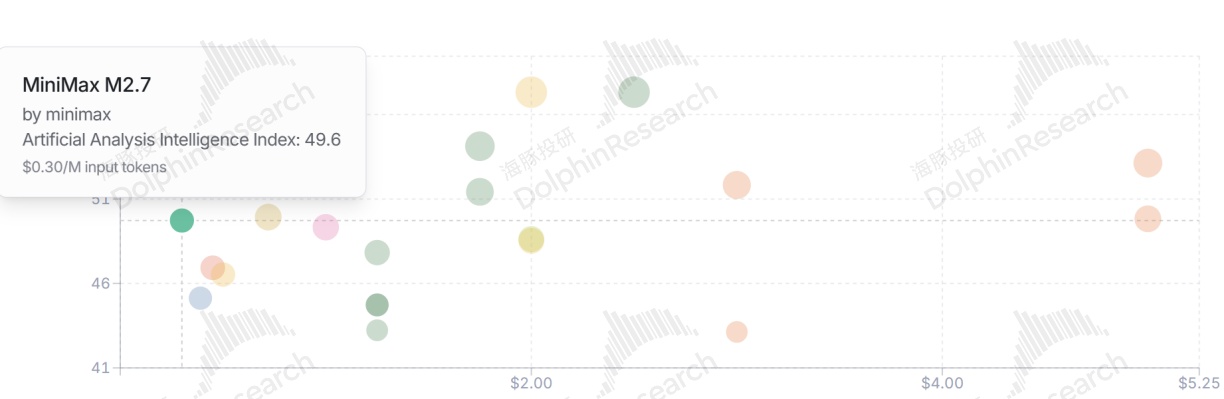 海豚君按 Token 输入价格相对模型智能指数的比值来看,在智能性超过 MiniMax 的大模型中,只有 DeepSeek 的定价更低,但 DeepSeek 以语言模态为主。再综合多模态能力时,DeepSeek 吸引力就不足了。