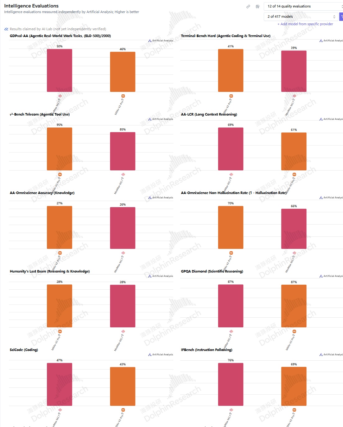 目前小米刚刚发布的 Mimo 也是多模态、也强调智能体 Agent 能力和 Coding 能力,具体来看,在智能体的真实工作任务上稍强,工具调用小米更强;Coding 能力上不分上下,Mimo-V2-Pro 在 Openrouter 的调用量短期超过了 MiniMax。整体上,二者各有所长,差距不大。