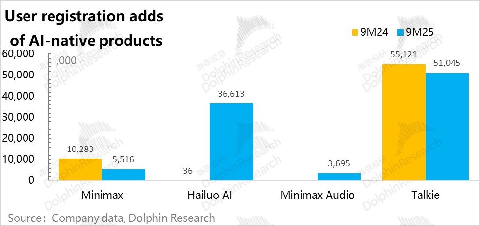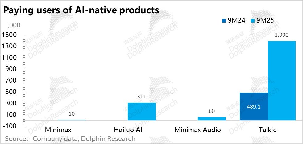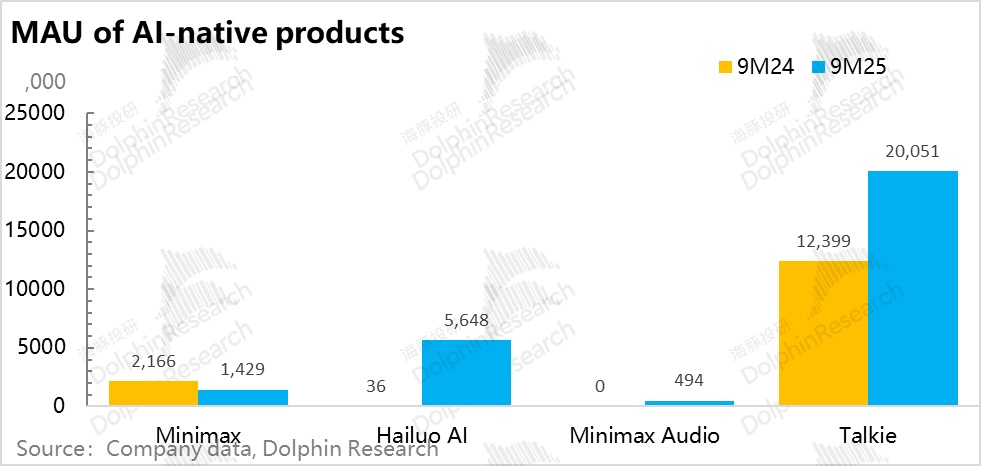 当然,从规模上来看,APP 家族中,用户最多的 Talkie 到 2025 年 9 月底是 2000 万月活,25 年新跑出来的应用海螺 APP 也不过 600 万月活。