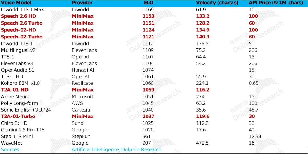 Speech 系列模型的 Elo 值(生成语音的自然度、表现力、情感真实度等维度)排名靠前、定价上相比同行也高了不少。