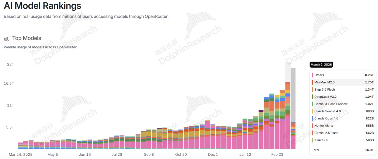 但在投入的回收能力上,无论是 MiniMax 收入对训练支出的覆盖能力,还是第三方 OpenRouter 显示的 token 调用量上,都体现出了明显的优越性。