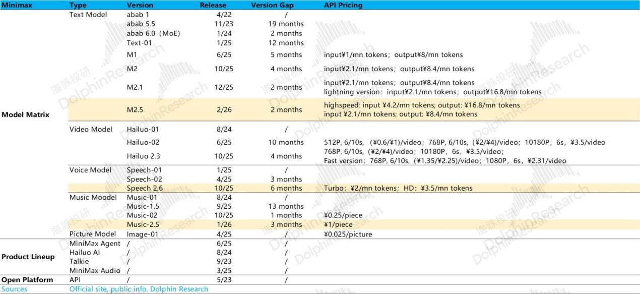 这点上,MiniMax 相当优秀,多模态路线走得非常早。公司因产品主打泛娱乐,语音模型之外还有单独的音乐模型,且模型迭代速度也相对较快,各类垂类模态上,基本按季更新,基座语言模型从 M2.5 到 M2.7 更是按月更新。