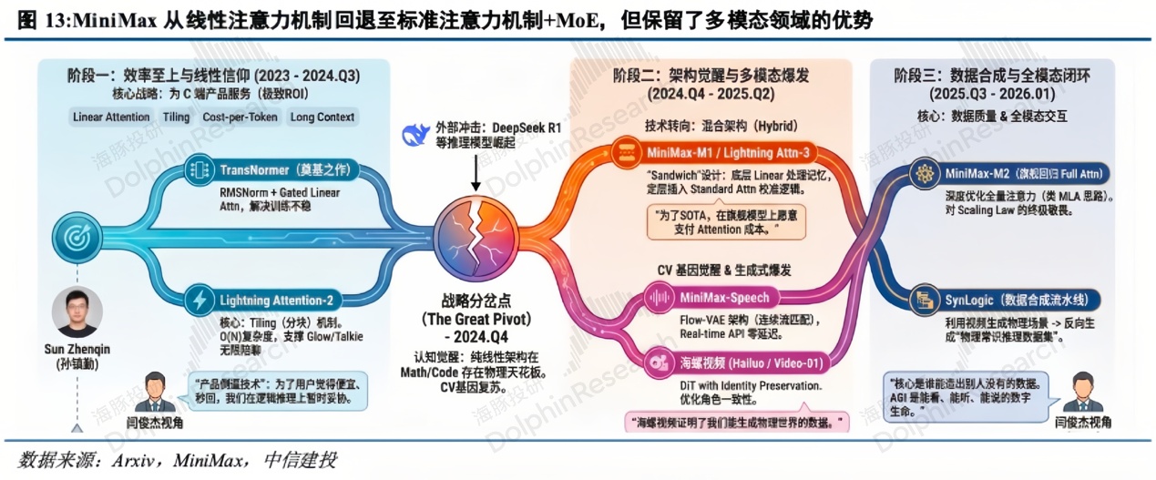 DeepSeek 的出现,给中国的同行实力演绎了算法创新带动模型能力,模型能力带动用户和使用案例的样本。DeepSeek 打样之后,MiniMax 开始更侧重模型技术本身,进入模型技术推进产品性能迭代,模型进入架构创新和多模态研发期