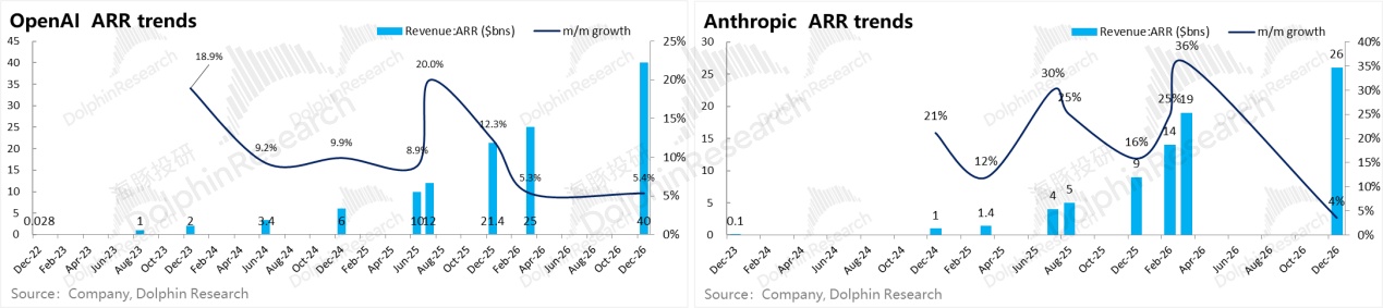 而偏向 to B 的 Anthropic 在 1-10 亿阶段,增长月率是大约 20%,从 10-100 亿还是 20%;核心是因为 to B 模型即服务模式下,模型能力提升几乎可以和创收加速同速推进。