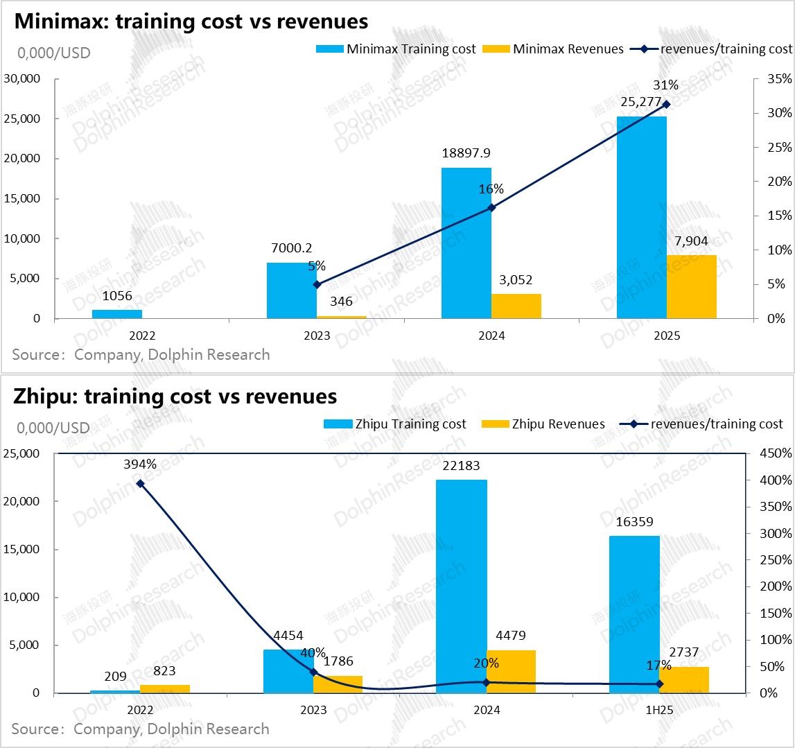 比如说,2025 年 MiniMax 一共投入了大约 2.5 亿美金的训练成本(接近 18 亿人民币),而智谱上半年就耗掉了 1.6 亿美金(超 11 亿人民币)。
