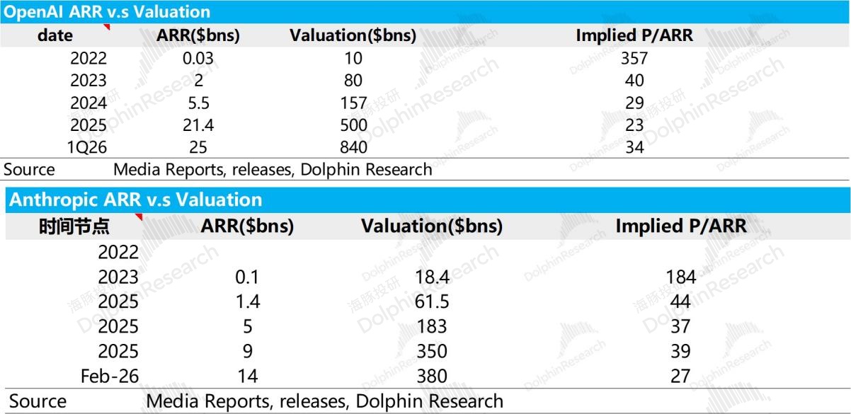 考虑到两家头部闭源公司在收入不足 10 亿美元的早期阶段,绝对收入尚不能充分反映其资产的真实价值,导致 PS 估值一度呈现出 200-400X 的超高状态。因此,海豚君取两家公司迈入 10 亿美金之后的 40X PS 来作为估值参考。