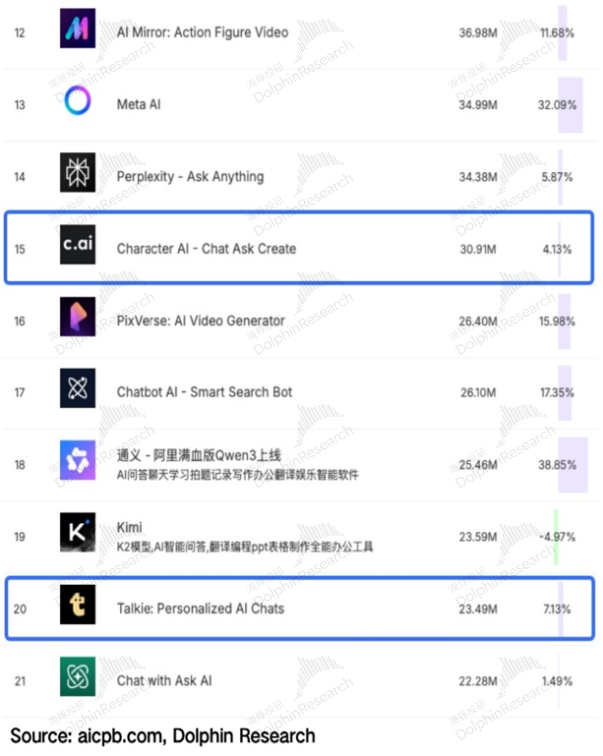 细分赛道龙二,MAU 维持高增速,付费稳步渗透。招股书披露, Talkie/星野的 MAU 已经高达 2000 万,同比增速约 62%;根据 aicpb 数据,2025 年 12 月全球 AI 产品应用月活排行榜中,Talkie/星野排名 20,陪伴类赛道中仅位列 Character.AI 之后。