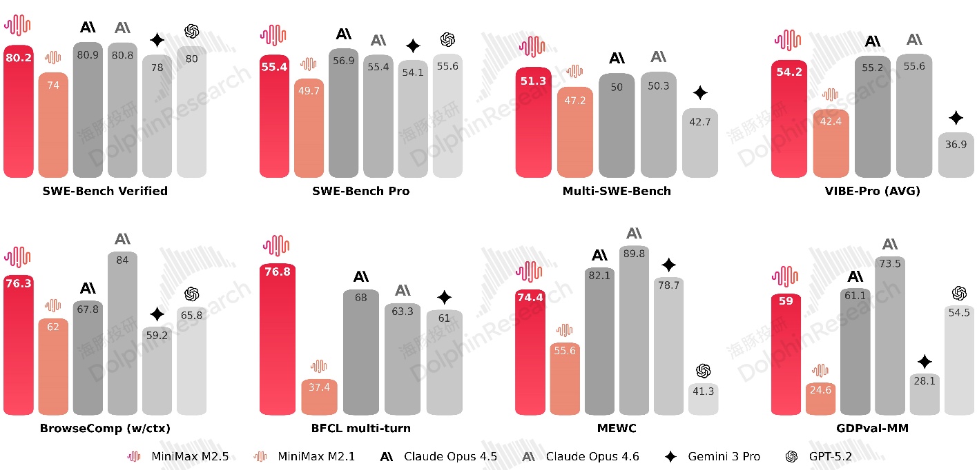 相比定价更便宜的 DeepSeek,MiniMax 模型 M2.5 在 Agent 和办公协同能力上更强,在衡量 Agent 能力的排行榜上,M 2.5 在代码解决(SWE-bench verified)、工具调用与指令遵循 (BFCL & VIBE)、模态校验(GDPval-MM)等各个方面表现都不错。