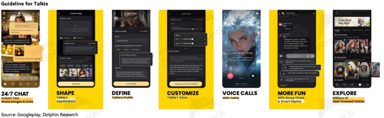 Talkie(海外)与星野(国内)基本可以理解为一个 AI 情感陪聊 APP。用户可以创建具有明显特长和技能的 AI 虚拟角色,其他用户可以跟这个 AI 角色互动和共创。