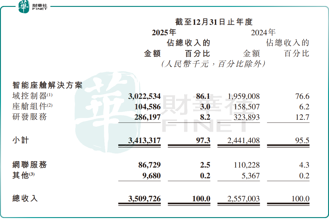作为国内智能座舱解决方案龙头,博泰车联收入高增,主要来自交付量的快速放量。2025年,公司智能座舱域控制器交付量达130万台,同比增长超40%;对应智能座舱解决方案收入34.13亿元,同比增长39.81%,占总营收比重达97.3%。