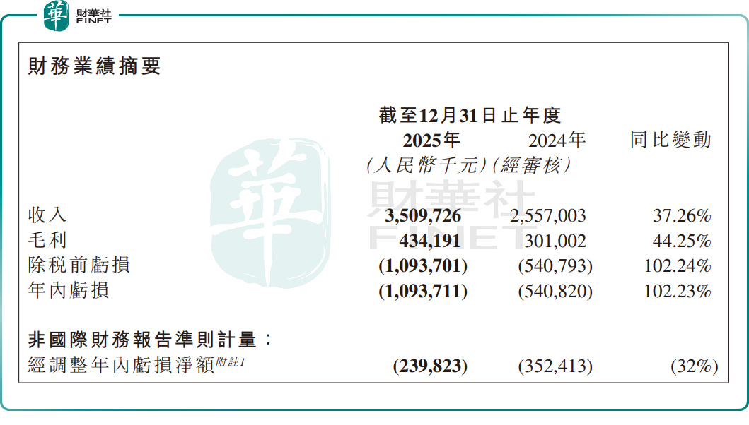 数据显示,2025年,公司实现收入35.1亿元,同比增加37.26%;但亏损同比扩大102.23%至10.94亿元;经调整净亏损为2.40亿元,同比收窄32%。