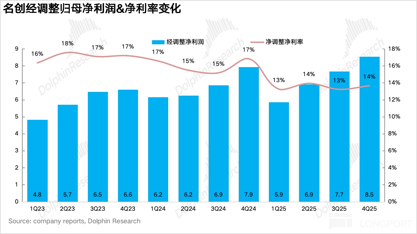 费用投放上,由于当前阶段名创仍处于海外(尤其是北美地区)的业务扩张阶段,面临大量的开店(四季度开店加速)、人员招聘、品牌投放等前置性投入,销售费用率同比大幅提升 5.3% 达到 26.5%,管理费用率相对持平,最终 4Q25 名创实现经调净利润 8.5 亿元,同比增长 7.7%,小幅不及预期。