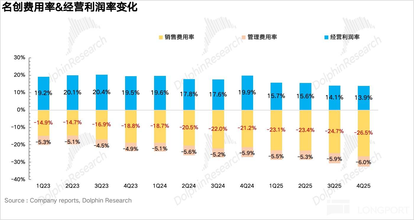 4、费用率仍在拉高,利润释放不及预期。费用投放上,由于当前阶段名创仍处于海外(尤其是北美地区)的业务扩张阶段,面临大量的开店、人员招聘、品牌投放等前置性投入,四季度销售费用&管理费用率均有所提升,最终 4Q25 名创实现经调净利润 8.5 亿元,同比增长 7.7%,小幅不及预期。