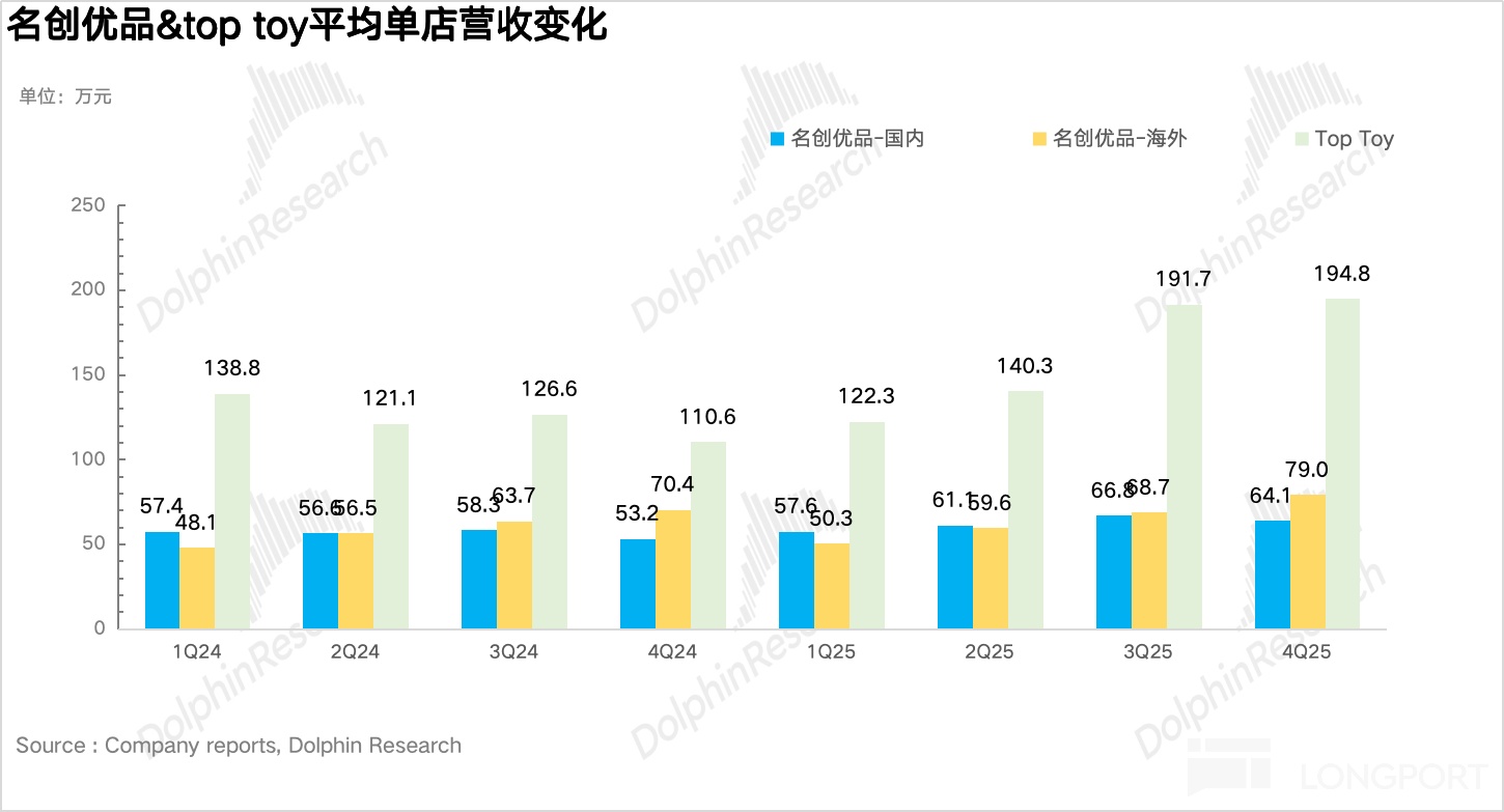 1、营收超过指引上限:4Q25 名创集团层面实现总营收 62.5 亿元,同比增长 32.6%,超出了三季度公司给出的 20%-25% 的指引。拆分来看,受益于名创大店战略的全面落地以及 11 月《疯狂动物城 2》联名效应的推动,Q4 国内同店营收重回双位数增长,名创优品主品牌同比增长 25.2%,环比提速,Top Toy 由于糯米儿等爆款 IP 的拉动,同比增长 112%,延续了三季度的高增长。