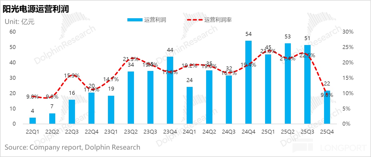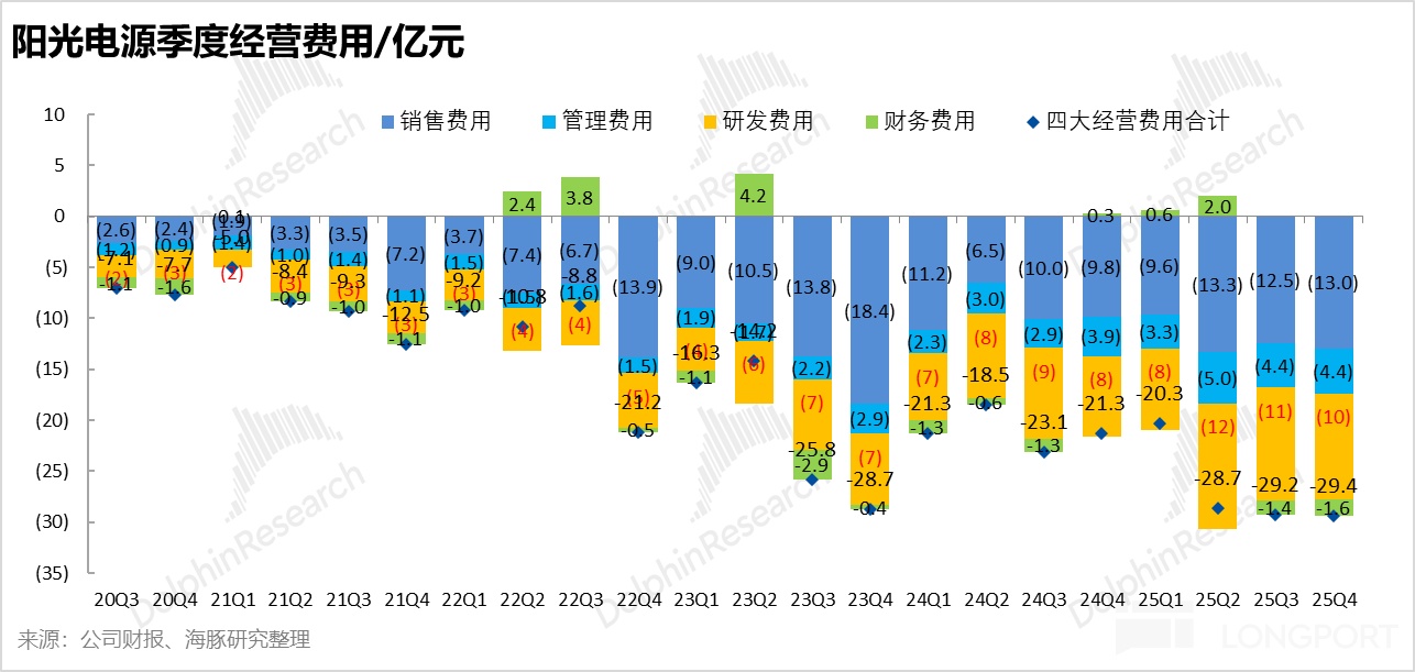营收失速叠加出海与新业务 “刚性支出”,反向杠杆急剧放大:为打造 “第三增长曲线” 加码 AIDC 电源与下一代储能技术,Q4 研发费用同比大幅提升 31.3% 至 10.3 亿;为铺设全球网络,销售费用近 13 亿,同比提升 32%。在毛利骤降与费用双高挤压下,Q4 运营利润同比暴跌近 60%。