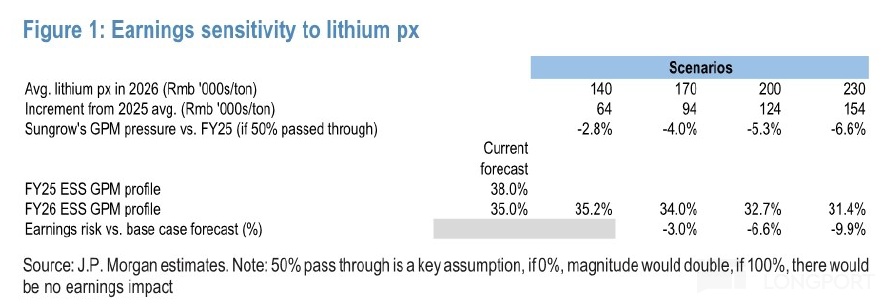 假设碳酸锂价格中枢上行至 14 万-23 万/吨区间,若只能与下游客户共担成本(即 50% 转嫁),将对阳光储能整体毛利率造成 3 至 7 个百分点 的沉重拖累;而若竞争极度恶化导致 0% 转嫁,利润拖累幅度将翻倍(负面影响达 6%-14%);仅在极其理想的 100% 完全转嫁情形下,才能保住现有盈利水平。