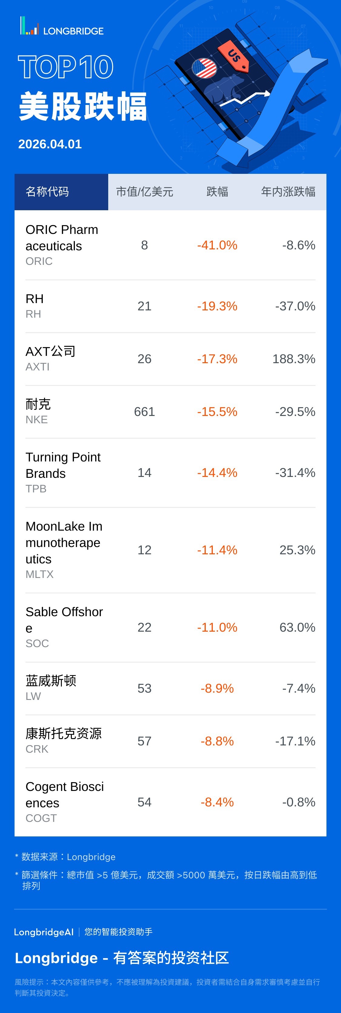 ORIC Pharmaceuticals(ORIC) 跌 41%,成交额 1.3 亿美元,年内累计跌 8.6%。