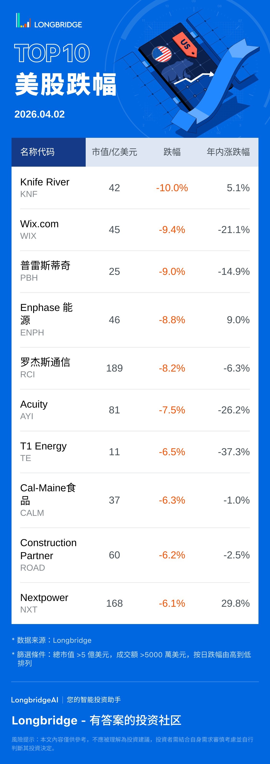 Knife River(KNF) 跌 9.99%,成交额 8503.6 万美元,年内累计涨 5.1%。