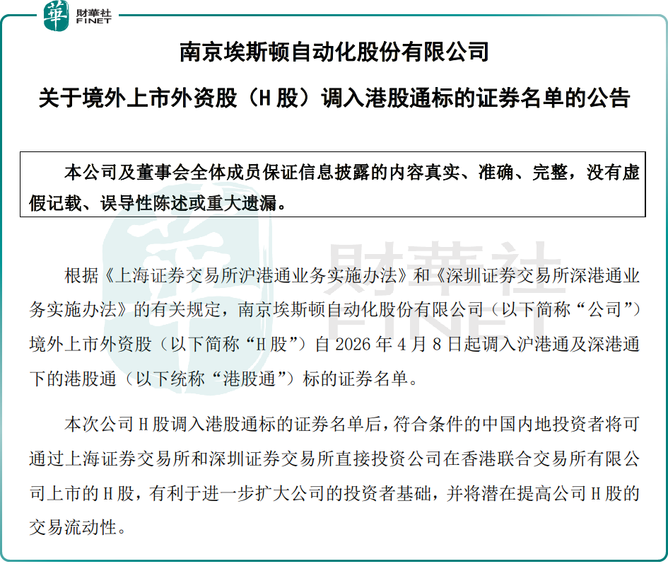 消息面,4月7日,埃斯顿发布公告称,公司H股自2026年4月8日起调入沪港通及深港通下的港股通标的证券名单。