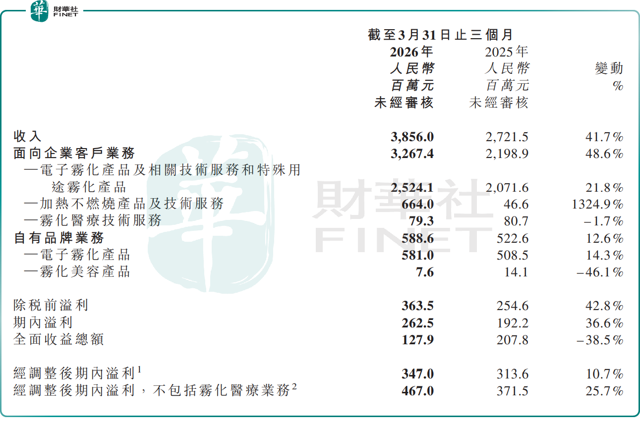 4月9日,思摩尔国际披露了2026年第一季度业绩快报。数据显示,公司收入约38.6亿元(单位人民币,下同),同比增长41.7%;净利润约2.63亿元,同比增长36.6%;经调整后净利润约3.47亿元,同比增长10.7%。