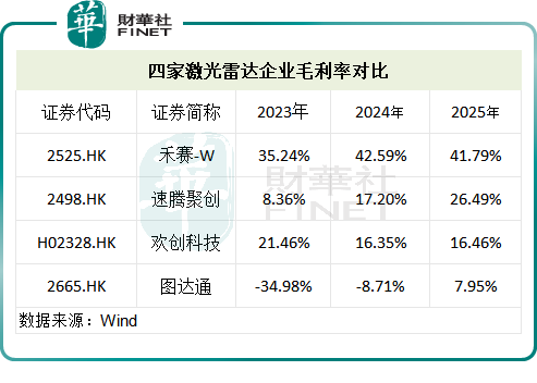 2023-2025年,欢创科技的毛利率分别为21.5%、16.3%和16.5%,整体呈下滑趋势。横向对比更能说明问题,以同样是激光雷达赛道的企业为例:禾赛2025年全年毛利率为41.8%,速腾聚创的毛利率提升至26.5%,其中机器人领域的激光雷达产品毛利率更是达到了39.7%。欢创科技16.5%的毛利率,尚不及速腾聚创整体水平的三分之二,与禾赛更是相差超过25个百分点。