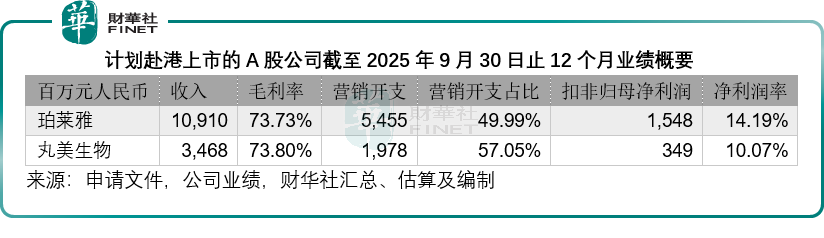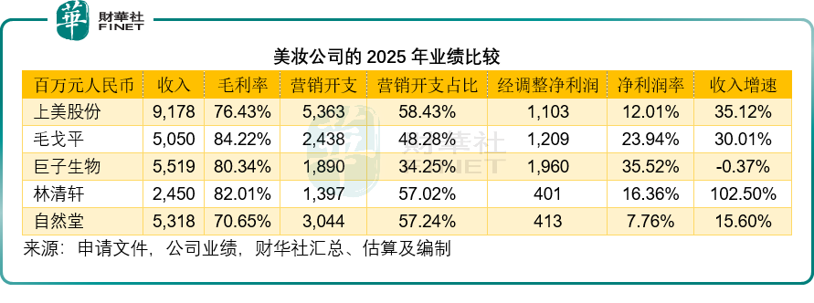 更令人担忧的是盈利能力。自然堂2025年的毛利率为70.65%,在可比公司中处于垫底位置——上美股份为76.43%,巨子生物为80.34%,林清轩为82.01%,毛戈平更是高达84.22%。而计划赴港的两家A股公司(截至2025年9月末止12个月业绩,下同)珀莱雅和丸美生物,毛利率也分别达到73.73%和73.80%,同样高于自然堂。